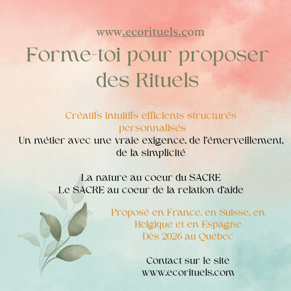 Les écorituels® tels que proposés dans cette formation s’appuient sur la connaissance de rites universels à ce qu’ils mettent en œuvre les forces de la Nature, l’environnement des personnes concernées indépendamment de leur origine culturelle ou religieuse. Ils s’adaptent soit à un accompagnement individuel dans le privé ou dans le cadre professionnel,  soit à des accompagnements en groupe (restreint, familial, cercles, communautés) : rites de passage biographique, passages saisonniers.